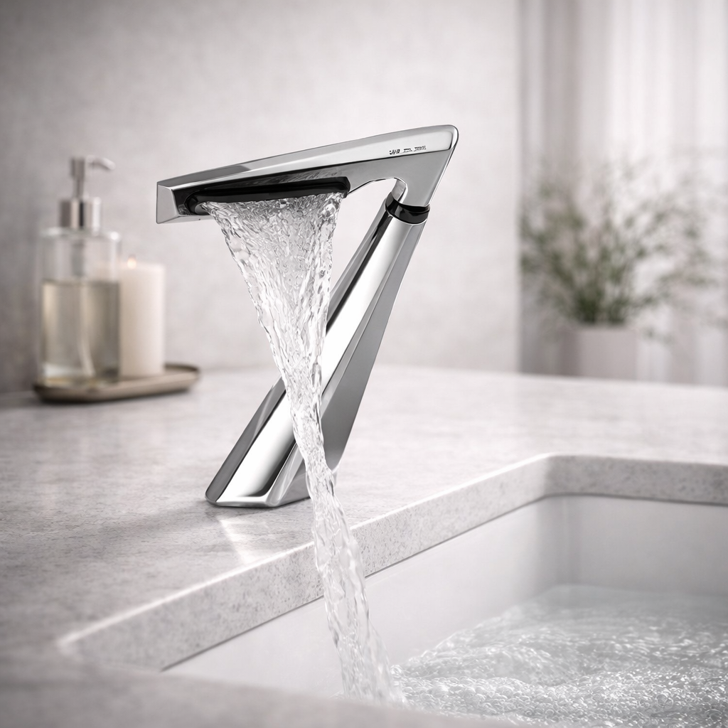 La mezcladora modelo A25001 destaca por su diseño innovador tipo cascada, pensado para transformar el lavamanos en un punto focal moderno y sofisticado. Su acabado cromado de alto brillo aporta limpieza visual, elegancia y una sensación de lujo contemporáneo.